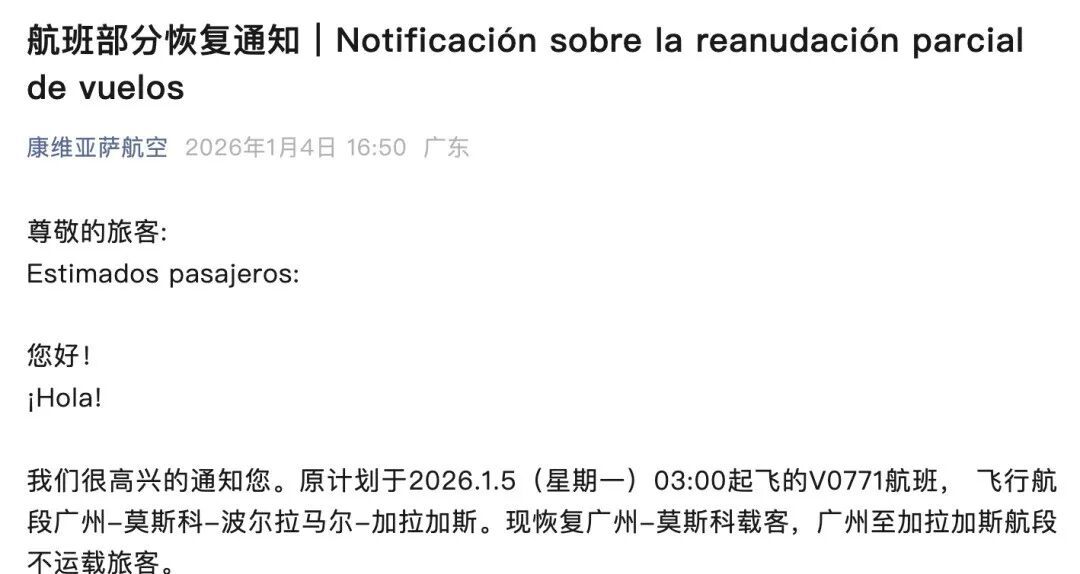 1月4日下午,委内瑞拉康维亚萨航空公司(委内瑞拉国家航空公司)在其官方公众号发布航班部分恢复通知,原计划于2026年1月5日(星期一)3时起飞的V0771航班,飞行航段广州-莫斯科-波尔拉马尔-加拉加斯。现恢复广州-莫斯科载客,广州至加拉加斯航段不运载旅客。